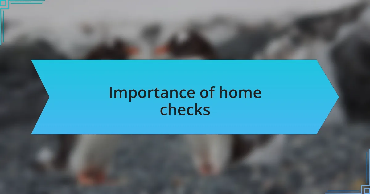 Home checks play a crucial role in the adoption process, serving as a key step to ensure the well-being of the animals. I remember walking through my home during my check, taking a moment to appreciate how I had tailored my space for a furry friend. It struck me how important it is for families to create an environment that meets the physical and emotional needs of a pet.